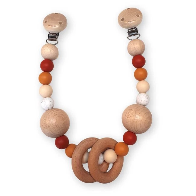 Deze gave wagenspanner van Chewies&more is gemaakt van siliconen kralen en beukenhouten kralen. De lengte van de spanner is ongeveer 42 cm. Hiermee is hij passend voor bijna elke kinderwagen. De clip dient bevestigd te worden aan het stofgedeelte van de kap. Verkrijgbaar in diversen kleuren. De siliconen kralen kunnen met water en mild sopje worden afgenomen. De houten kralen kan je afnemen met een vochtige doek en aan de lucht laten drogen. Je kan de chewie niet uitkoken, in de sterilisator of vaatwasser plaatsen.