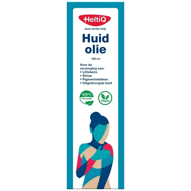 HeltiQ Huidolie is een specialistisch product dat naast hydratatie van de uitgedroogde huid tevens effectief helpt bij de vermindering van diverse alledaagse huidproblemen, zoals littekens, striae, huidstriemen en pigmentvlekken. De huidolie kan ook preventief worden toegepast, waarmee de kans op het ontstaan van striae gedurende de zwangerschap, of huidstriemen als gevolg van een groeispurt of een snelle gewichtstoename wordt verminderd. De 100% natuurlijke formule bevat vitamine A en D en is dankzij zijn vochtinbrengende en hydraterende eigenschappen tevens geschikt voor de verzorging van de verouderde en gerimpelde huid. HeltiQ Huidolie trekt snel in, is dermatologisch getest en geschikt voor alle huidtypen, waaronder de gevoelige huid.