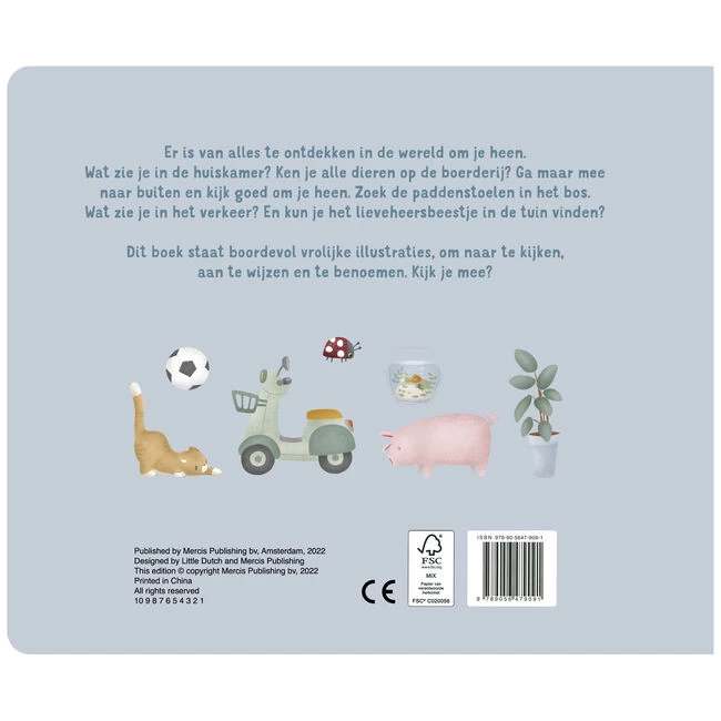 Er is van alles te ontdekken in de wereld om je heen. Wat zie je in de huiskamer? Ken je alle dieren op de boerderij? Zoek de paddenstoelen in het bos. En kun je het lieveheersbeestje in de tuin vinden? Dit stevige kartonboek staat vol vrolijke illustraties, die uitnodigen om naar te kijken, aan te wijzen en te benoemen. Kijk je mee? Ook leuk als kraamcadeau. Dit boek heeft 18 pagina’s van karton inclusief omslag. Afmetingen: 23 x 27,5 x 1 cm (lxbxh).