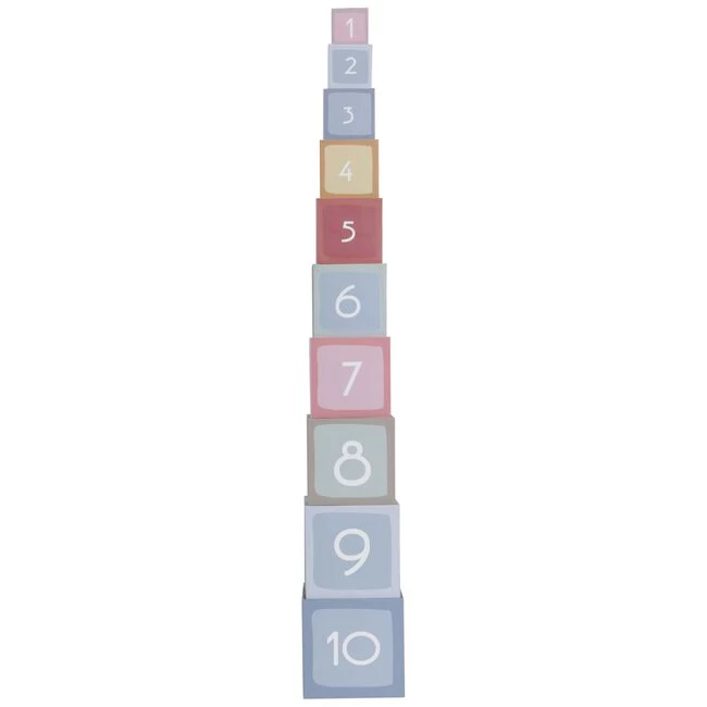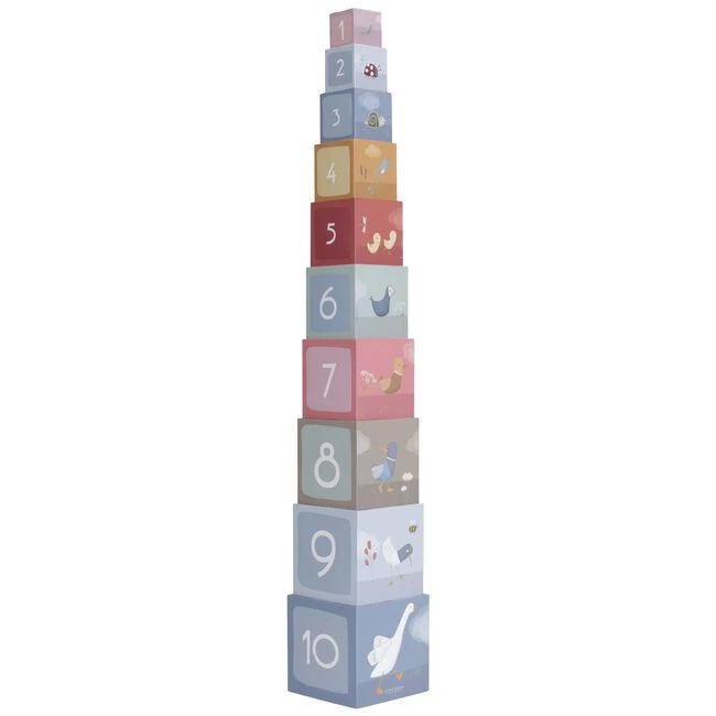 De Little Dutch 10-delige stapelblokken met afbeeldingen uit de serie kleine gans leren kindjes puzzelen, stapelen en tellen tot 10. De blokken zijn geïllustreerd met onze herkenbare Gans en al zijn vriendjes die rond de vijver op het platteland wonen. De kubussen zijn van stevig FSC karton gemaakt en kunnen tegen een stootje. Het kleinste blok is 5 cm en het grootste blok 14 cm. Geschikt vanaf 18 maanden.