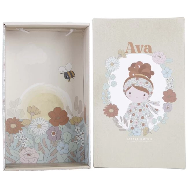 Dit is de lieve Ava. Deze pluche knuffelpop in haar vintage jurkje kan niet wachten om geknuffeld te worden. Ze vindt het heerlijk om door velden met hoog droog gras te rennen en te genieten van de middagzon. Met haar schattige bloemenjurkje en haarbandje kan ze niet wachten om jouw nieuwe beste vriendin te worden. Ze zal er altijd voor je zijn als je wilt spelen of een dikke knuffel nodig hebt. Wat wordt jullie eerste avontuur samen? Madeliefjes plukken? Of picknicken met thee en koekjes? Ava is zacht en knuffelig, 35 cm lang en is verpakt in een mooie opbergdoos.
