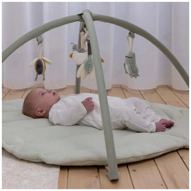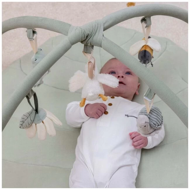 Dit mooie zachte speelkleed van Little Dutch in de vorm van een blad is het ideale speelkleed voor jouw kleintje. De vrolijke speeltjes uit het thema Little Goose zitten bevestigd aan de speelboog. De speeltjes stimuleren jouw kindje om te voelen en te ontdekken. De speeltes kunnen los gehaald worden en bijvoorbeeld gebruikt worden in de kinderwagen. Elk speeltje stimuleert op een andere manier. De vleugels van Little Goose maken een krakend geluid, er zit een spiegeltje aan de slak, de kikker piept en de bloem rammelt. Geschikt voor kindjes van 0-6 maanden. Afmeting: 91 x 99 x 49 cm.
