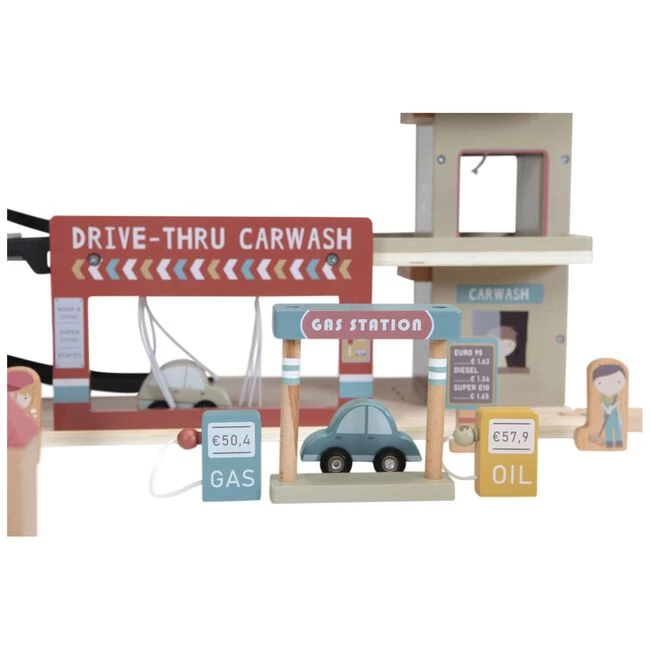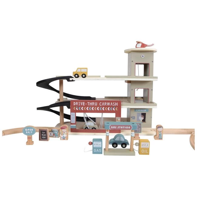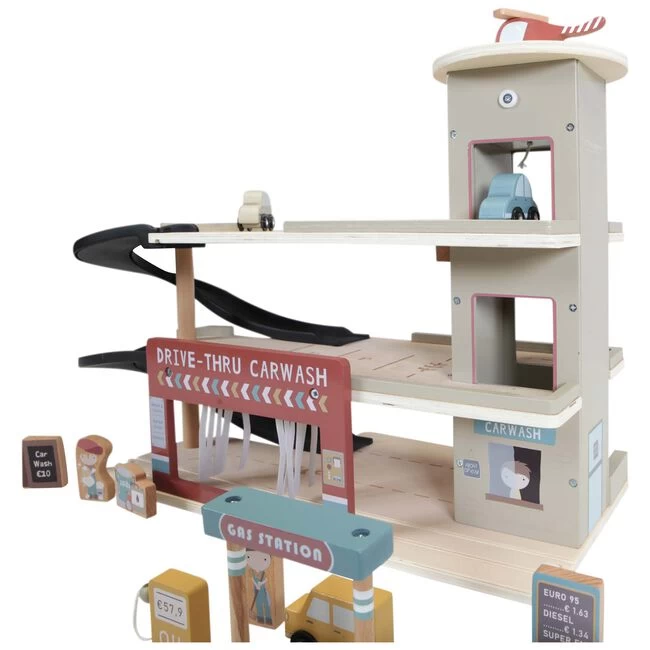Parkeer je auto’s in de houten garage van Little Dutch. De garage kan leuk apart aangeschaft worden of als onderdeel van de houten treinbaan van Little Dutch! De garage wordt geleverd inclusief 3 auto’s, 1 helikopter, 3 poppetjes, 2 benzinepompen en 3 reclameborden. De autogarage is 45 x 23,5 x 38cm.