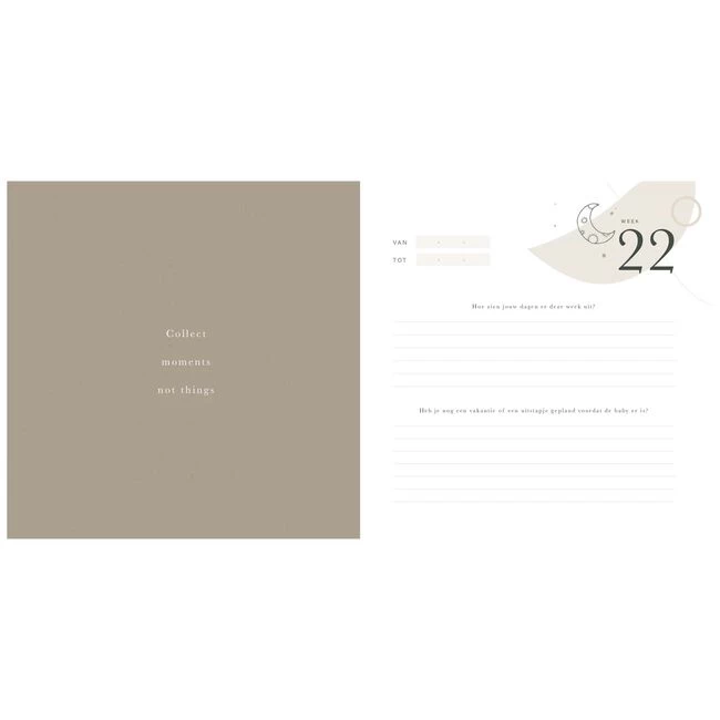 In het zwangerschapsdagboek van Maan Amsterdam kun je elke week een paar vragen beantwoorden. Bijvoorbeeld over hoe jij je voelt, over de echo’s, tips van de verloskundige, maar ook over de babykamer, over wat jou bezig houdt en waar je naar uit kijkt. Er is tevens voldoende ruimte om zelf te schrijven wat je wilt en om foto’s in te plakken, bijvoorbeeld van echo’s maar ook inspiratiefoto’s voor het geboortekaartje of de babykamer. Verder bevat het boek achterin handige checklists om in te vullen en is er ruimte om belangrijke gegevens te noteren. Zo maak je voor jezelf, én voor later, een mooi herinneringsboek. Het boek heeft een hardcover met leeslint en is gemaakt van stevig 200 grams papier. Het is vormgegeven met zachte neutrale kleuren en is voorzien van lieve illustraties en leuke quotes. Een musthave voor aanstaande mama’s en ook super leuk om cadeau te geven aan een mama-to-be! Afmetingen: 21x21x2 cm (BxHxD).