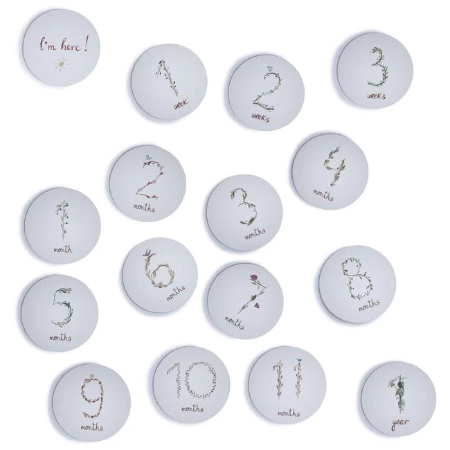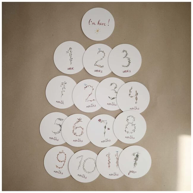 Documenteer de groei van je baby met deze set van 16 prachtig geïllustreerde mijlpaalkaarten, liefdevol ontworpen in Zweden. Elke dubbelzijdige kaart toont grillige aquarelontwerpen en speciale ruimte om herinneringen, gedachten en notities op te schrijven en je baby vast te leggen terwijl ze groeien. Afmetingen: 4,5 cm doorsnede.