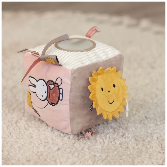 Je kindje zal zich niet snel vervelen met deze leuke activiteitenkubus van nijntje. Op elke zijde van de kubus is iets anders te ontdekken zoals leuke afbeeldingen, verschillende stoffen, labeltjes om aan te voelen, een spiegeltje en een siliconen nijntje ring. Ook zit er binnenin de kubus een belletje voor een leuk rammeleffect. Leeftijd: vanaf de geboorte.