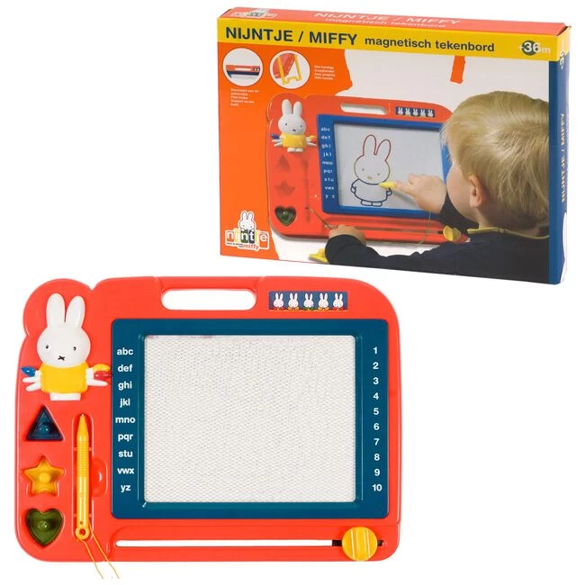 Het tekenbord van Nijntje is een magnetisch bord inclusief pen en en drie stempels in verschillende vormen. Lekker tekenen zonder vieze vingers te krijgen. Je kan het bord zo weer schoon vegen en opnieuw beginnen. Verpakt in een mooie full-colour doos. Geschikt voor kinderen vanaf 18 maanden.