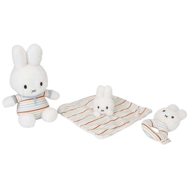 Deze mooie geschenkdoos van Nijntje x Little Dutch is het perfecte cadeau voor een babyshower of als je op kraamvisite gaat. In deze set zitten drie hele mooie zachte items waar je kindje mee kan knuffelen, kroelen en spelen. De set bestaan uit: een Nijntje knuffel, een knuffeldoekje en een rammelaar. Alle drie de Nijntje items hebben een mooi Little Dutch vintage print. Samen zitten ze verpakt in een geschenkdoos die ook in vintage stijl is. Een feest om te geven en zeker om te krijgen. Beschikbaar in twee prints: vintage Sunny stripes en vintage little flower. Geschikt vanaf de geboorte.