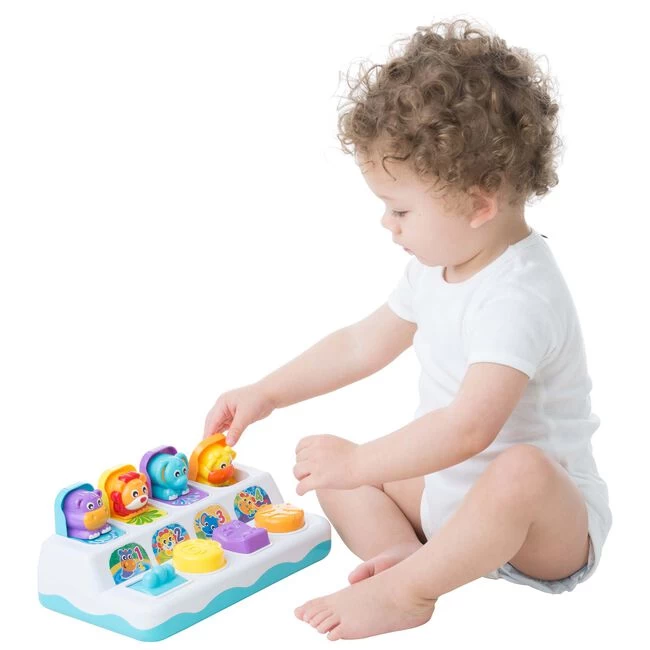 Draai, klik en druk op de knoppen, kleine spruit. Wanneer je de juiste combinatie maakt, komen de dieren (nijlpaard, leeuw, olifant en koe) tevoorschijn met licht en geluid! De twee speelwijzen stimuleren de cognitieve ontwikkeling van je kleine spruit. Je baby drukt op de knoppen om de geluiden van dieren te horen. Dat stimuleert de oorzaak-gevolgrelatie en zijn fijne motoriek. Vervolgens, bij het tweede spel, leert je kindje probleemoplossend denken, door te raden welk diertje welk geluid maakt. Deze Pop-Up boerderijdieren van Jerry Class werkt op 3 AA-batterijen (inbegrepen). Geschikt vanaf de geboorte.
