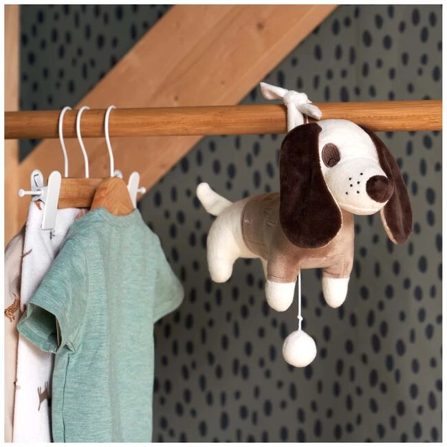 Met dit lieve muziekdoosje uit het Snuffel de Teckel thema van Prénatal is je kindje snel in dromenland! Het muziekdoosje is te bevestigen aan het bedje of aan de box. Trek aan het onderste bolletje en het muziekdoosje speelt een melodietje. Ook een leuk kraamcadeau! Ontdek ook de andere artikelen in het Snuffel de Teckel thema.