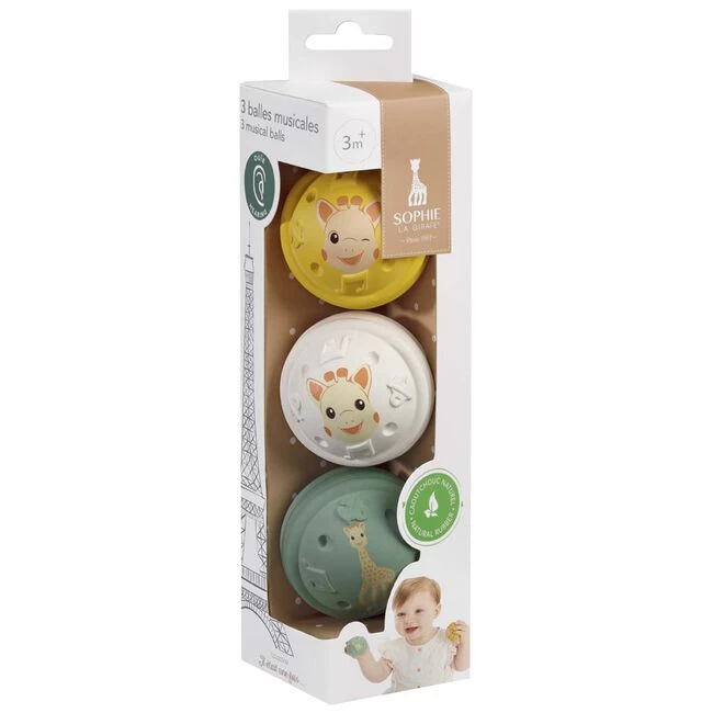 Met deze leuke muzikale speelballen van Sophie de giraf, kan je kindje uren spelen. De verschillende kleuren, van de ballen, stimuleert het zicht van je kindje en nodigt uit om te spelen en de geluidjes te ontdekken. Elke bal maakt zijn eigen geluid, zo klinkt er een belletje of een knisperend geluid wanneer je kindje in de bal knijpt. Dit stimuleert de ontwikkeling van je kindje. De ballen hebben een fijn formaat en zijn makkelijk te pakken met kleine handjes. De balletjes zijn gemaakt van natuurlijk, zacht en soepel materiaal en daarom ook veilig voor je kindje om in te bijten.