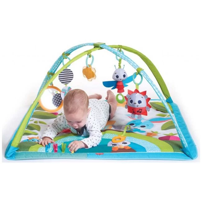 Deze Tiny Love gymini is een speelmat vol plezier en leuke muziekspeeltjes! De speelmat bevat 16 ontwikkelingsactiviteiten. Zo kan je kindje met het spiegeltje zijn tummy-time oefenen, oefenen met pakken met de hangspeeltjes, bijten op de bijtspeeltjes en zijn fijne motoriek oefenen met de knisperende blaadjes. Het muziekspeeltje speelt 3 verschillende liedjes. De bogen van het speelkleed kunnen worden weggeklapt om het makkelijk te maken om bijvoorbeeld een luier te verschonen. Het speelkleed kan makkelijk opgevouwen en vervoerd worden als het niet gebruikt wordt. De speelmat kan in de wasmachine en is 75x75x45cm.