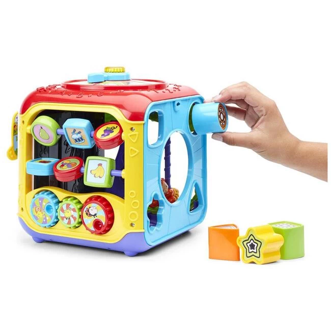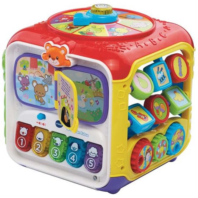 Kies een kant en maak plezier met de VTech Baby Activiteiten Kubus, een educatieve en interactieve speelgoed kubus. De kubus is een kleurrijke kubus om te ontdekken. Druk op de interactieve toetsen of draai de wijzer en maak kennis met dieren, cijfers, kleuren, etenswaren, voorwerpen en muziek. Luister tijdens het spelen naar de grappige geluiden, vrolijke zinnetjes en gezongen liedjes voor nog meer speelplezier. Het interactieve boekje activeert gezongen liedjes. Het bewegen van de verschillende onderdelen en het plaatsen van de vormen in de juiste opening draagt bij aan de ontwikkeling van de fijne motoriek en de oog-handcoördinatie. 10 melodietjes en 4 gezongen liedjes, regelbaar volume. Geschikt vanaf 9 maanden. Inclusief 2 AA (test)batterijen.