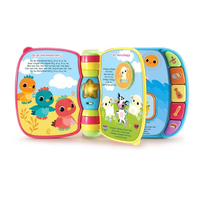 Laat je kindje op een interactieve manier kennismaken met 6 bekende kinderliedjes door middel van het VTech liedjesboek. Het liedjesboek is Nederlands gesproken en heeft een stevig en duurzaam design. De beweegbare figuurtjes op de bladzijden helpen de fijne motoriek te ontwikkelen en de mooie kleurrijke illustraties stimuleren de visuele ontwikkeling van je kindje. Type batterij: AAA
