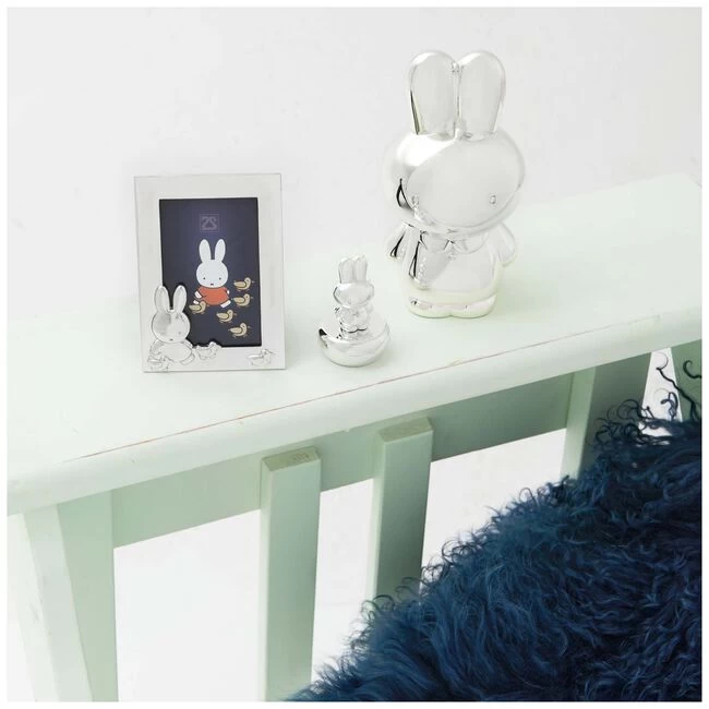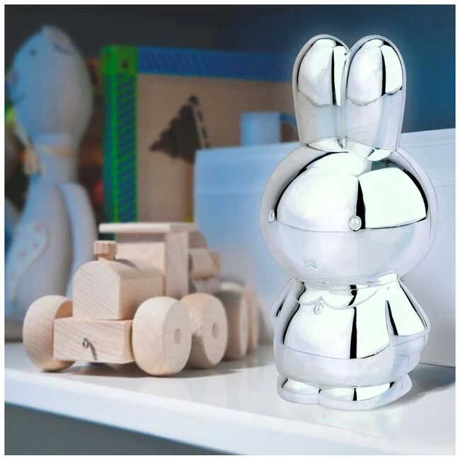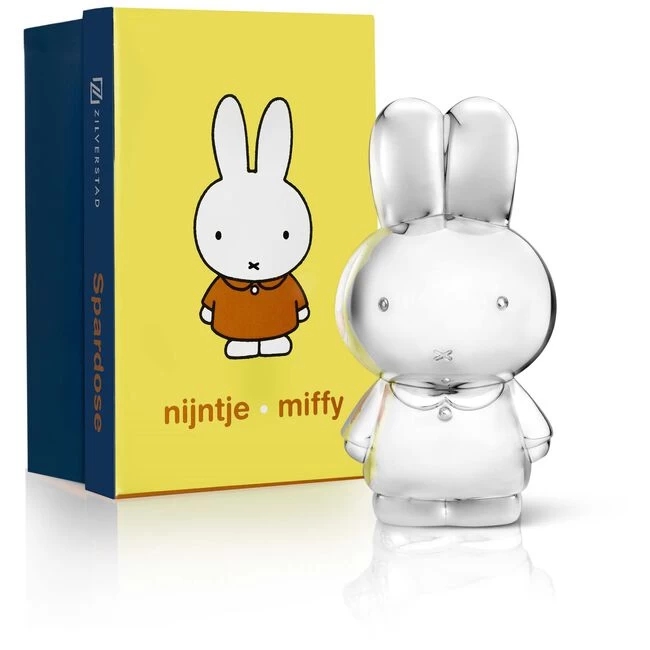 Mooie, glanzende spaarpot in de vorm van het beroemde konijn nijntje. De spaarpot kan gegraveerd worden bij een juwelier, wat het een persoonlijk geschenk maakt. Deze nijntje spaarpot is in zilver kleur, poetsen is overbodig. Afmetingen: 6,9 x 7,8 x 14,8 cm. In kleurrijke geschenkverpakking.